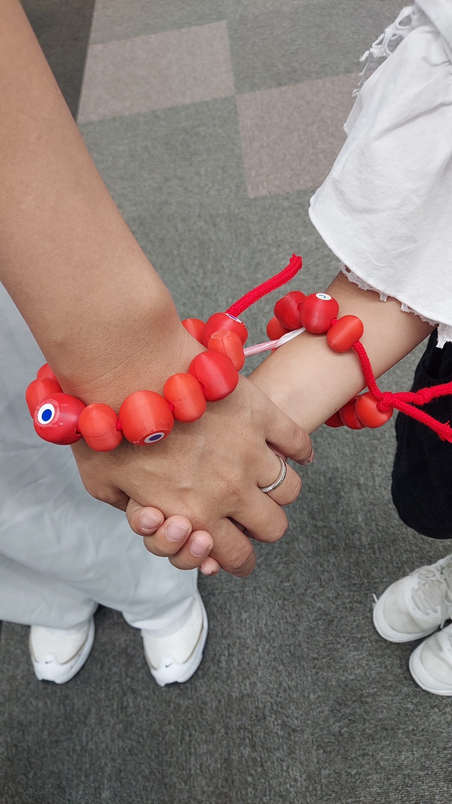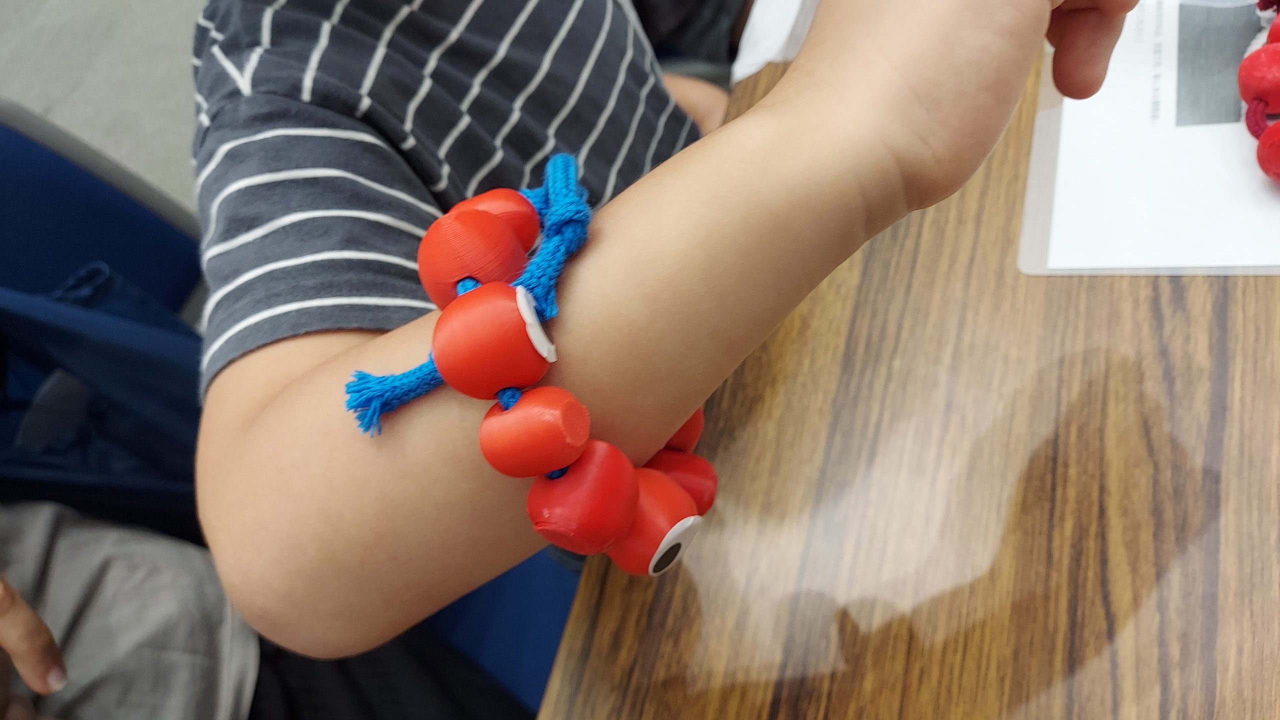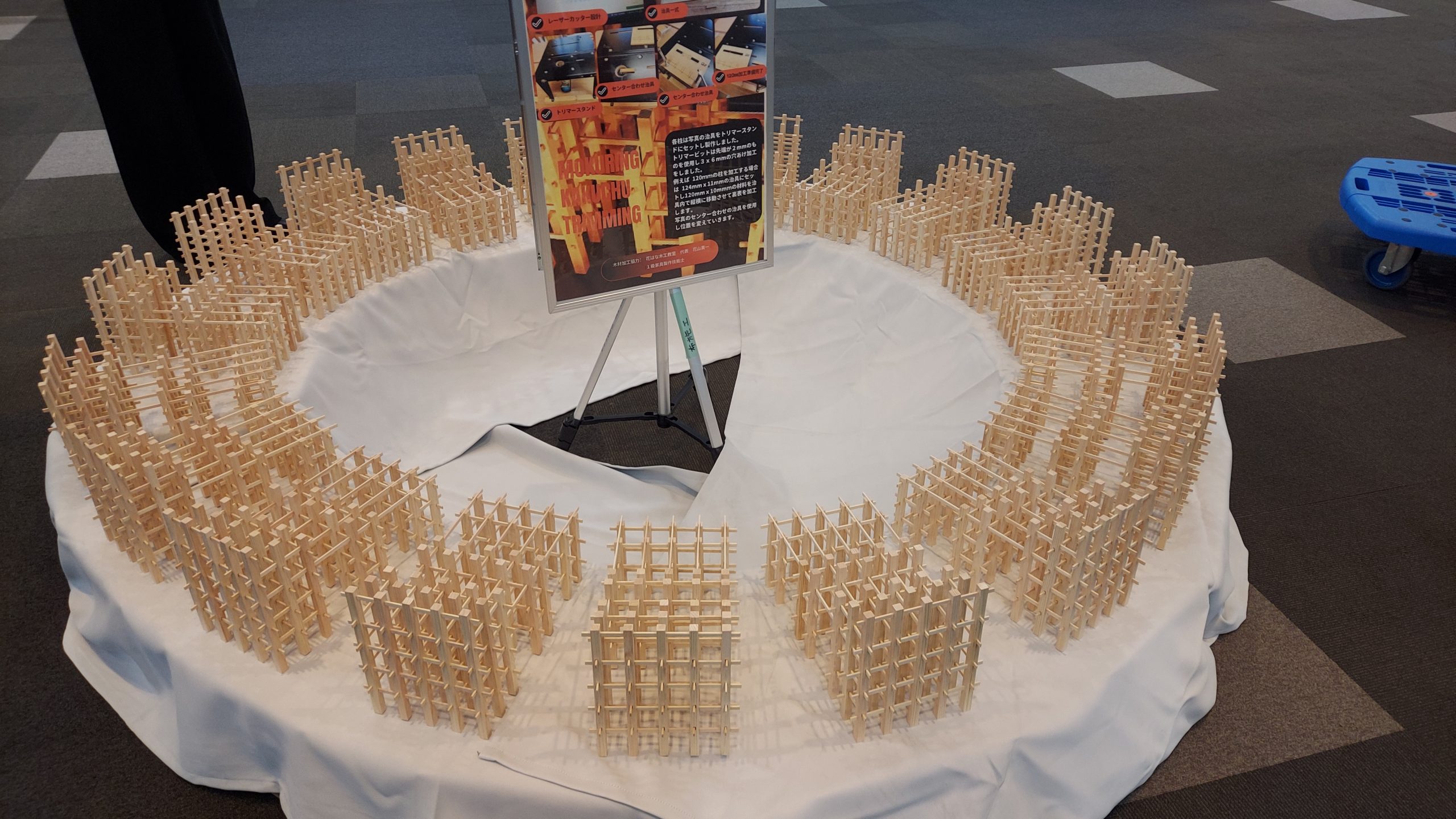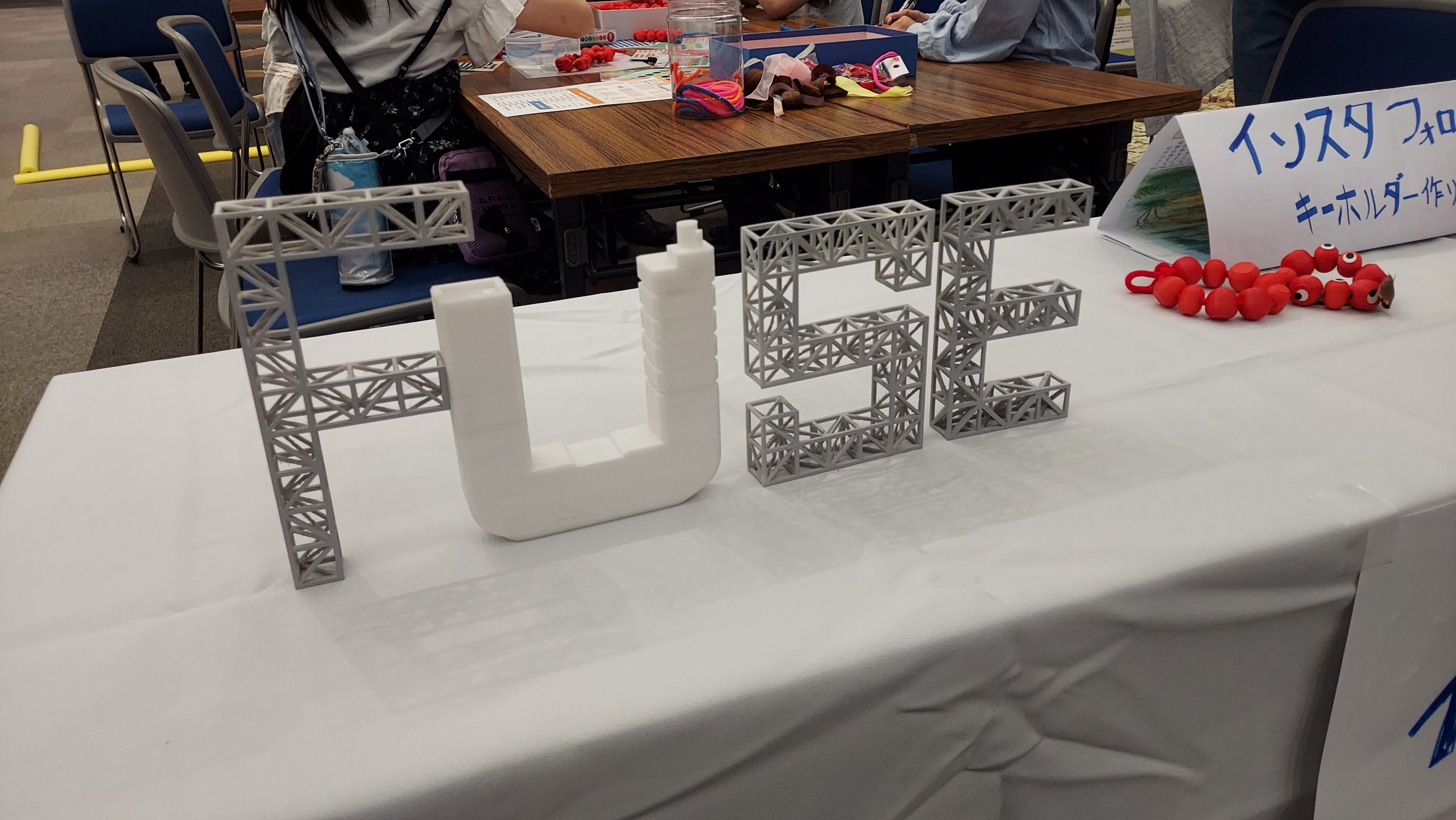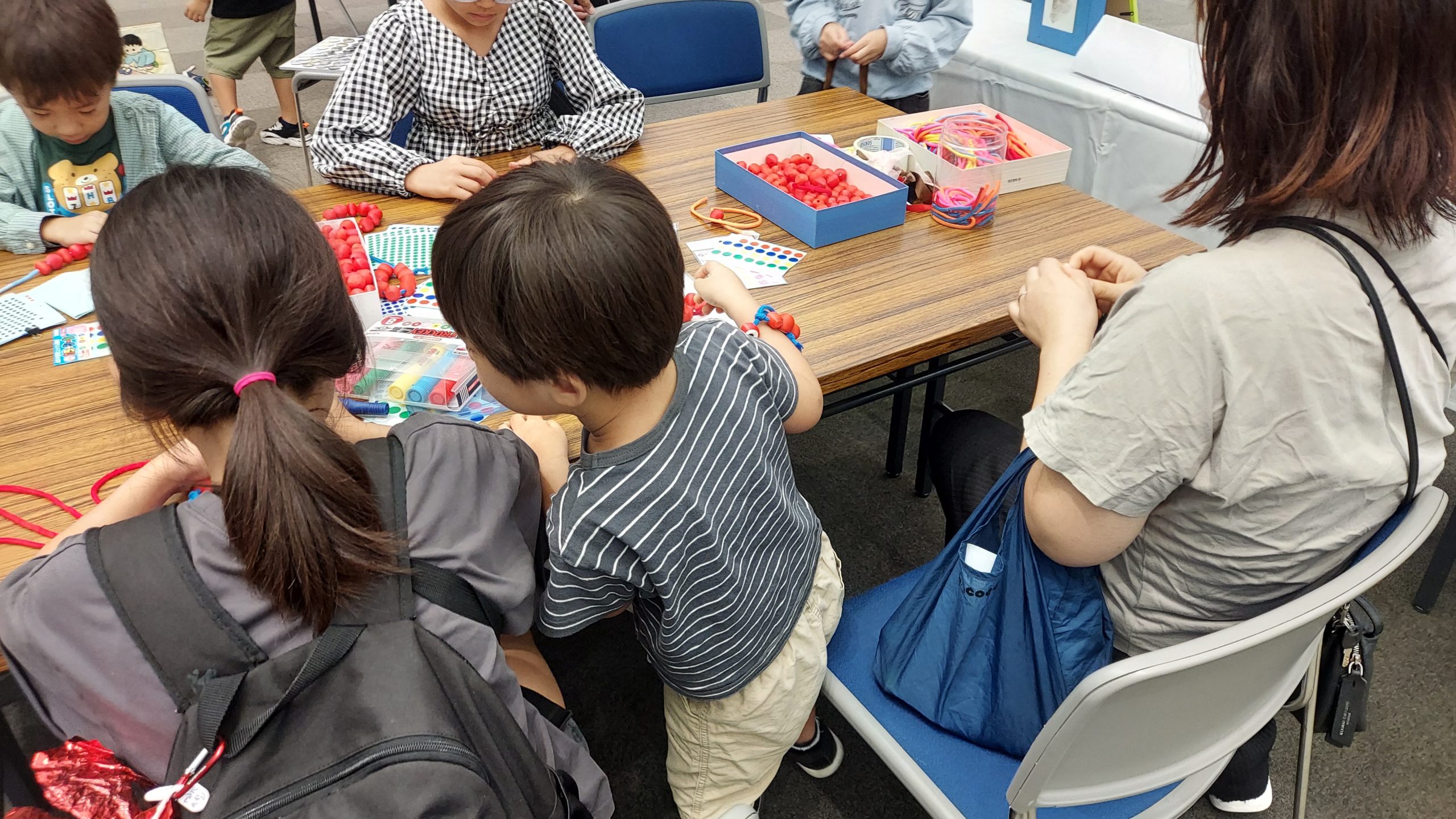 本校からは、大屋根リングの模型の展示とキーホルダー・ブレスレット作成体験を実施しました。100セット用意したのが、昼過ぎにはなくなり大盛況でした。